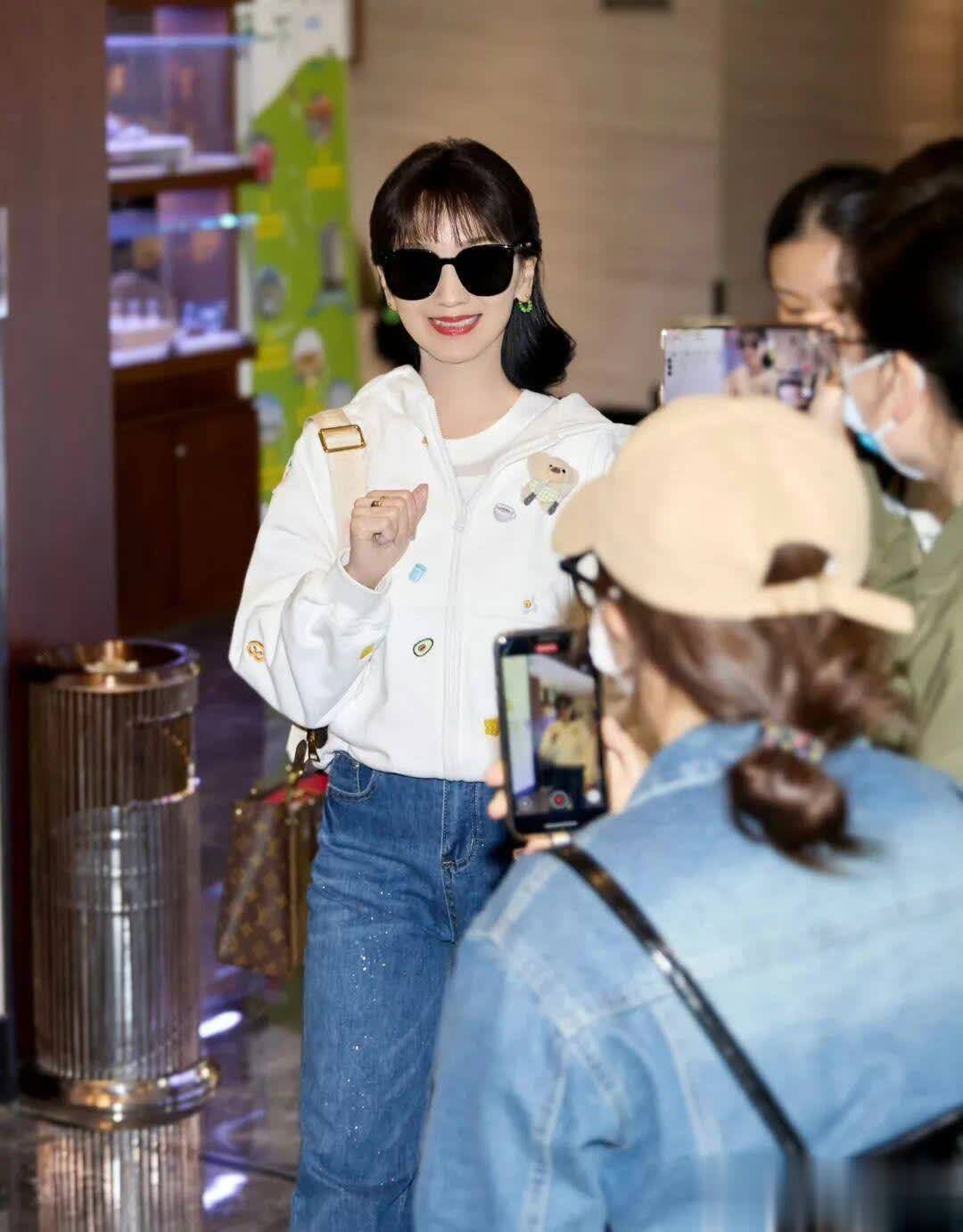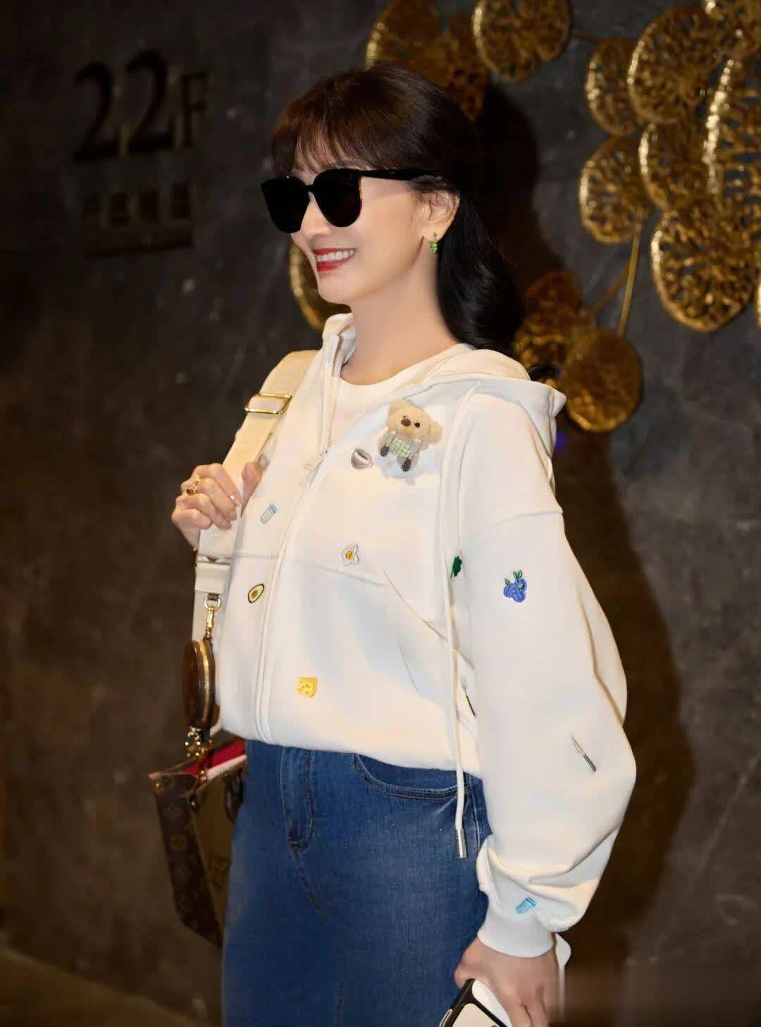下装她选择了一条带细闪设计的开叉牛仔裤。深蓝色牛仔面料百搭又耐穿,裤身的细闪在光线下若隐若现,比普通牛仔裤多了一份精致感;裤脚的不规则开叉设计,既能修饰腿型,又能在走路时露出脚踝,显得轻盈不笨重。脚踩一双小白鞋,与上衣颜色呼应,整体造型和谐统一。
