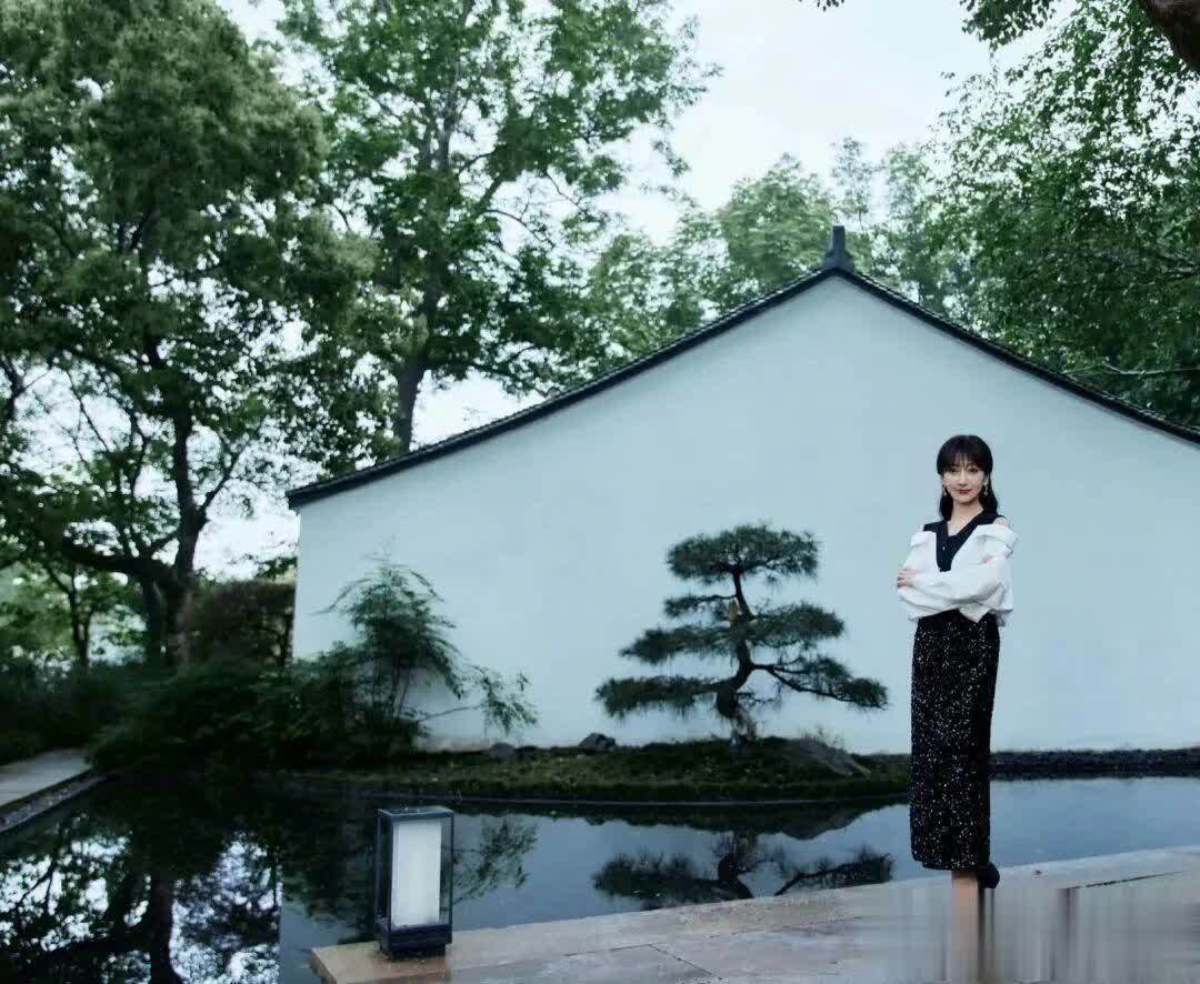 她选择了一条轻盈通透的雪纺碎花裙,浅杏底色晕染着浓淡相宜的红玫瑰印花,色彩柔和不刺眼,与身后的绿意盎然的江南园林完美相融,氛围感直接拉满。